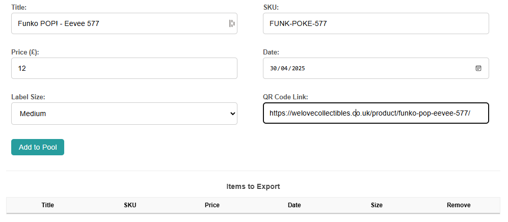 Once the details are entered, the user clicks “Add to Pool.” The item appears in a list of tags ready for printing. The key flexibility here, as requested by WLC, is that each item in the pool retains its individually selected size, allowing staff to prepare a batch of mixed-size tags in one go. When ready, they simply hit “Export Labels,” and the system generates a print-ready file with all the tags formatted correctly, complete with QR codes linking back to the online listings.